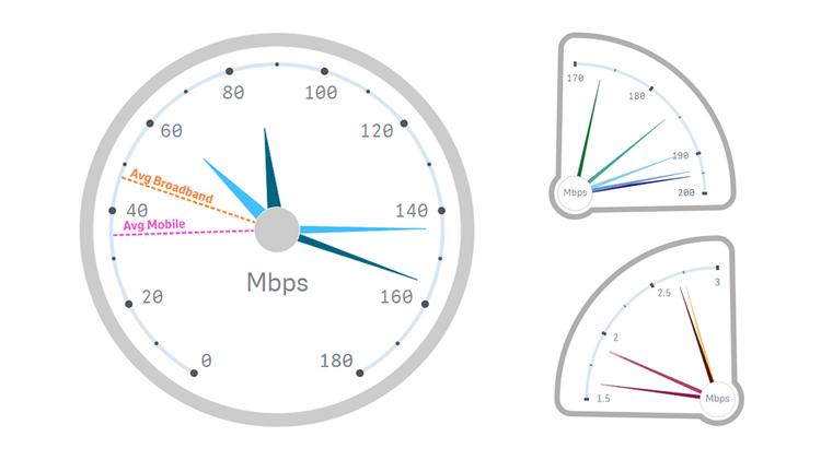 Analysieren Sie weltweite Internetgeschwindigkeiten anhand von Ookla-Daten, visualisiert in eindrucksvollen, kreisförmigen Gauge-Diagrammen mit unserer intuitiven Qlik Sense Erweiterung. Starten Sie mit einem Überblick auf einen Blick über die durchschnittlichen Geschwindigkeiten von Festnetz-Breitband und Mobilfunk in allen Ländern. Ermitteln Sie anschließend die schnellsten und langsamsten Internetgeschwindigkeiten nach Netztyp, auf jedem Kontinent und weltweit. Vergleichen Sie zum Schluss die Internetgeschwindigkeiten beliebiger zwei Länder oder Kontinente.