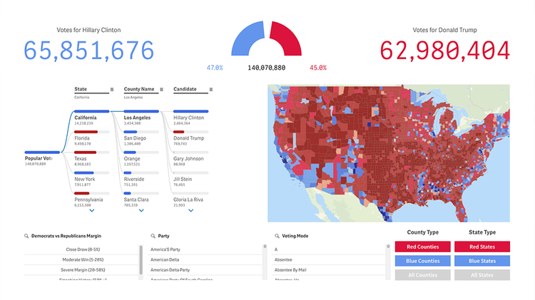 Gewinnen Sie ein tiefes Verständnis der Dynamik der US-Präsidentschaftswahlen. Analysieren Sie die Ergebnisse mithilfe interaktiver Visualisierungen, darunter Karten, Dekompositionsbäume mit KI-Splits, Rundinstrumente und mehr. Tauchen Sie ein in Daten zu Volks- und Wahlmännerstimmen auf nationaler, bundesstaatlicher und Bezirksebene. Erkunden Sie die Auswirkungen von Swing States, den Einfluss von Drittparteien und sogar fiktive Kandidaten — von Daenerys Targaryen bis Donald Duck. Entdecken Sie Trends, Margen und Muster, die Amerikas Wahl geprägt haben — mit Plänen, die Analyse bis zurück zu George Washington auszudehnen.