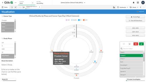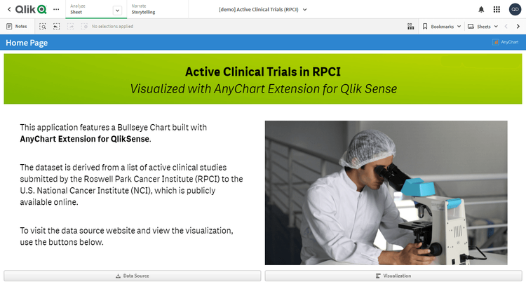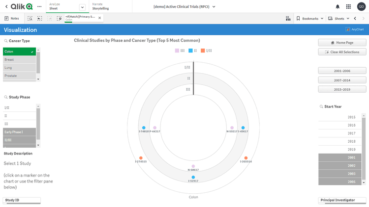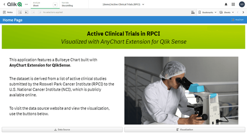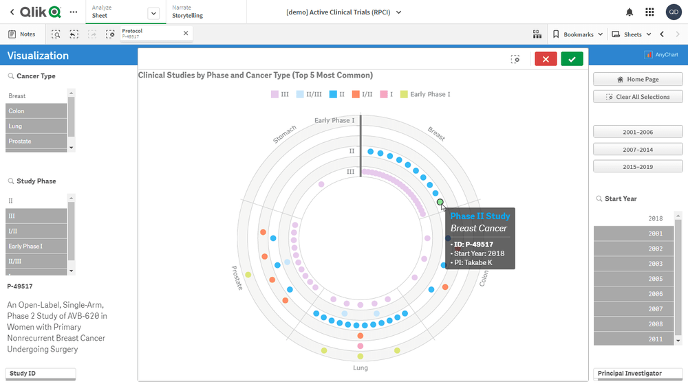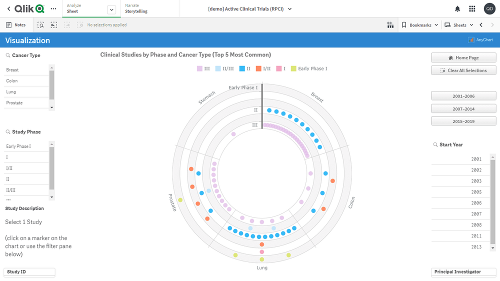 Esta aplicación presenta un Gráfico de Diana creado con la extensión AnyChart para Qlik Sense. El conjunto de datos se deriva de una lista de estudios clínicos activos enviada por el Roswell Park Cancer Institute (RPCI) al U.S. National Cancer Institute (NCI), disponible públicamente en línea.