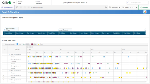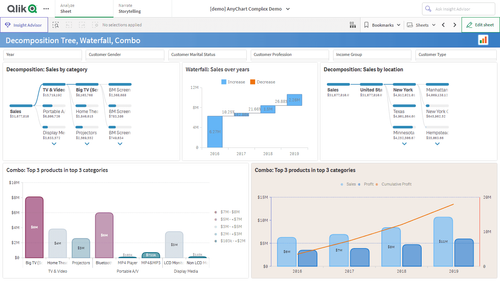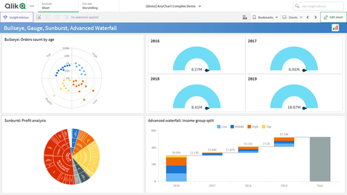 このアプリケーションには、Qlik Sense 向け AnyChart 拡張機能で構築された分解ツリー、ガントチャート、コンボチャート、サーキュラーゲージ、ブルズアイチャート、サンバーストチャート、タイムラインチャート、ウォーターフォール & アドバンストウォーターフォールチャートのビジュアライゼーションが搭載されています。データは架空のものです。