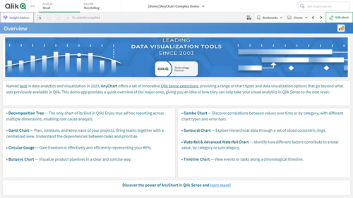 2023 年にデータ分析とビジュアライゼーション分野で最高評価を受けた AnyChart は、革新的な Qlik Sense 拡張機能を提供しています。主要な拡張機能をクイックデモでご紹介し、Qlik におけるビジュアルアナリティクスを次のレベルへ引き上げる方法をご覧ください。分解ツリー、ガントチャート、コンボチャート、サーキュラーゲージ、ブルズアイチャート、サンバーストチャート、タイムラインチャート、ウォーターフォール & アドバンストウォーターフォールチャートを体験できます。