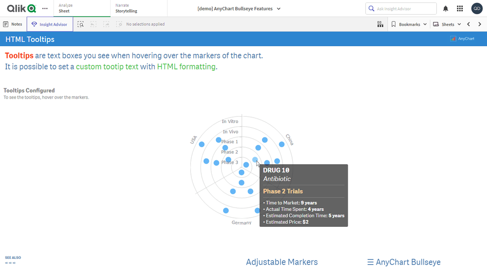 ブルズアイチャートは、製品パイプラインを明確かつ簡潔に可視化するために広く利用されています。臨床試験がどのようにフェーズを進行していくかを図示した架空の医薬品パイプラインを通じて、直感的に使える Qlik Sense 用ブルズアイチャート拡張機能の主要な特長をご覧ください。柔軟な軸やグリッド、カスタマイズ可能なラベルとマーカー、条件付きカラーリング、HTML ツールチップなど、多彩な機能が実際の動作で確認できます。