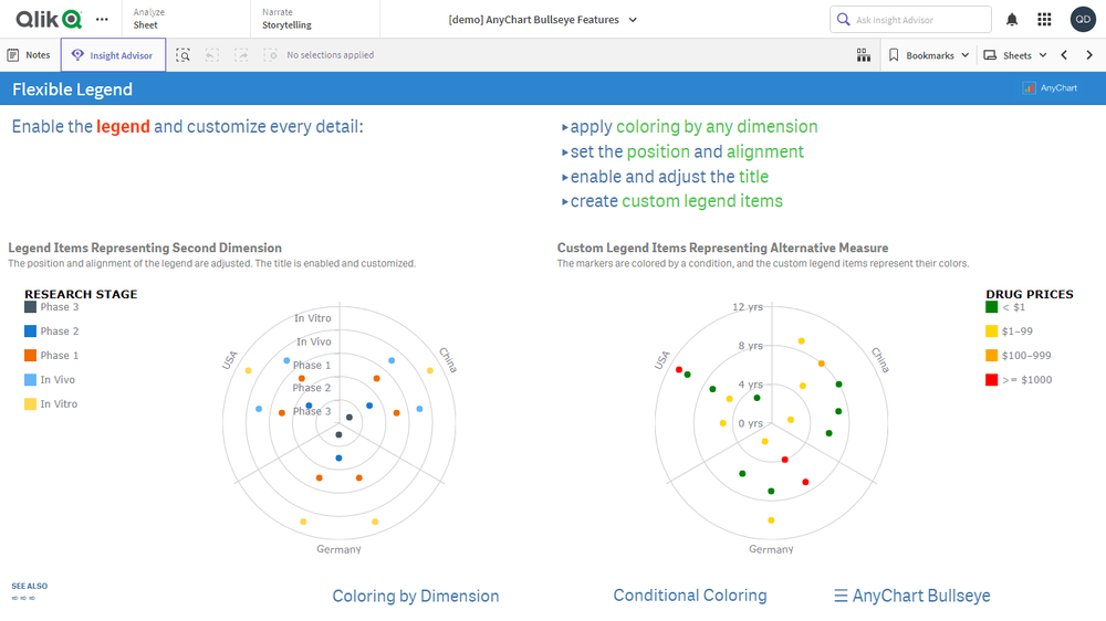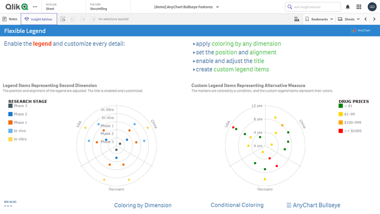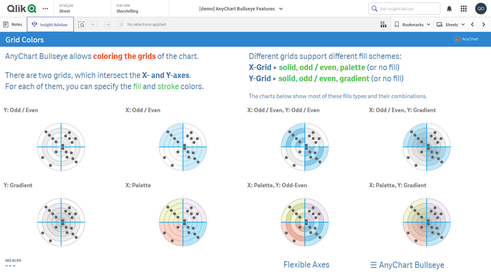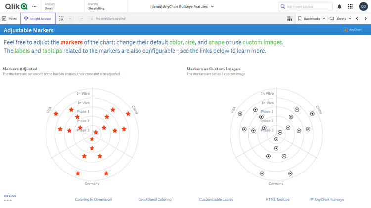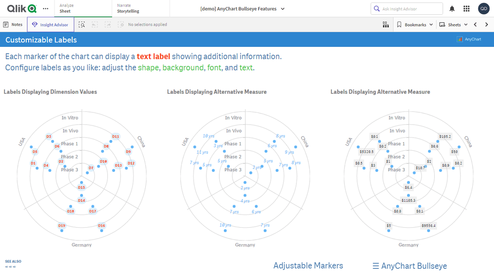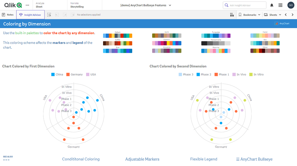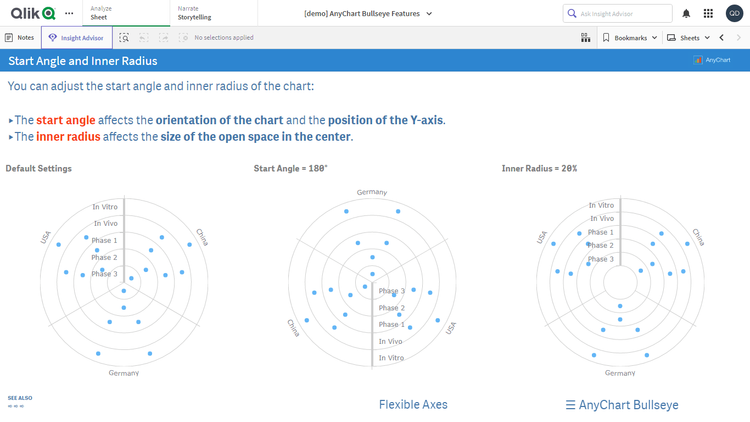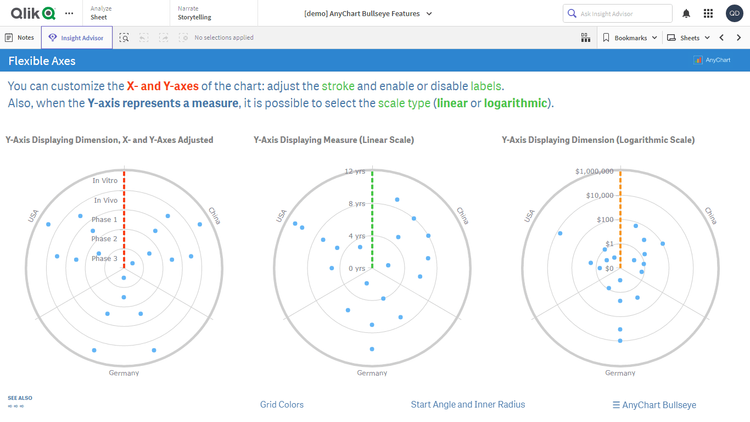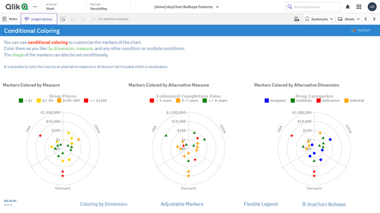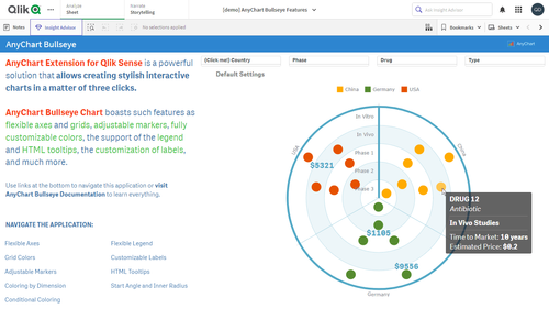 このアプリケーションには、Qlik Sense 用 AnyChart 拡張機能で構築されたブルズアイチャートが搭載されています。データセットは架空のものです。