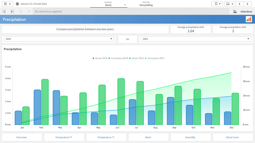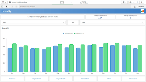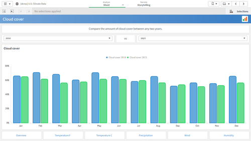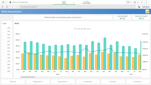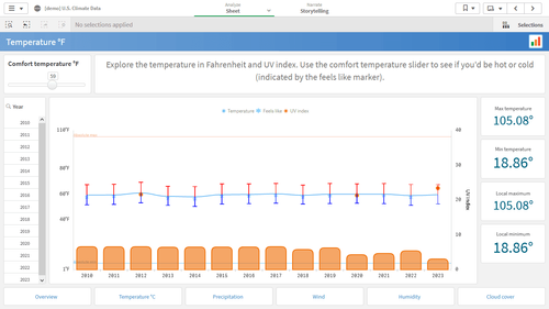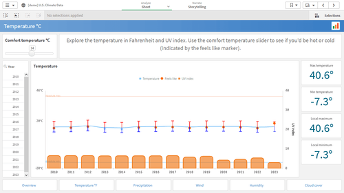 2010 年から 2023 年までの米国の気候データを多角的に確認しましょう。気温をモニタリングし、天候の快適度を評価できます。降水、風、湿度、気圧、UV 指数、雲量などのデータを深掘りし、前年比のトレンドを比較。Qlik Sense 向け専用拡張機能による柔軟な複数のコンボチャートで、さらに多くの発見が得られます。