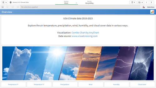 このアプリケーションには、Qlik Sense 用 AnyChart 拡張機能で構築されたコンボチャートが搭載されています。データは Kaggle の U.S. Climate Data データセットから取得したものです。