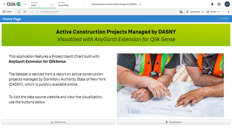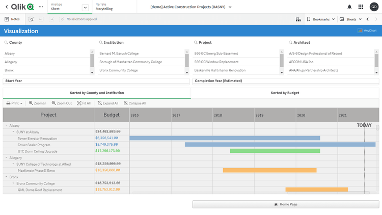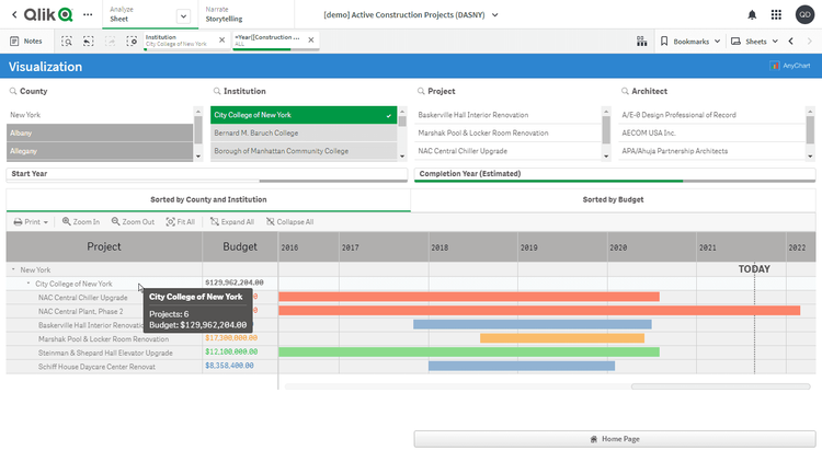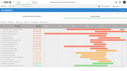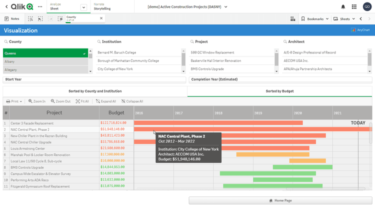 この Qlik Sense デモアプリケーションでは、プロジェクト・ガントチャートをAnyGantt extension for Qlik Senseで2種類実装しています。データセットは、DASNY が公開する進行中の建設プロジェクトのレポートに由来します。