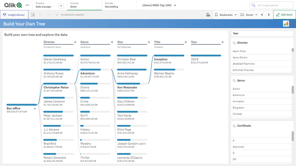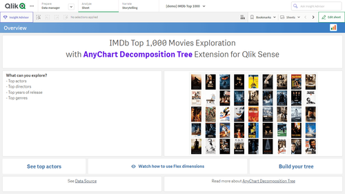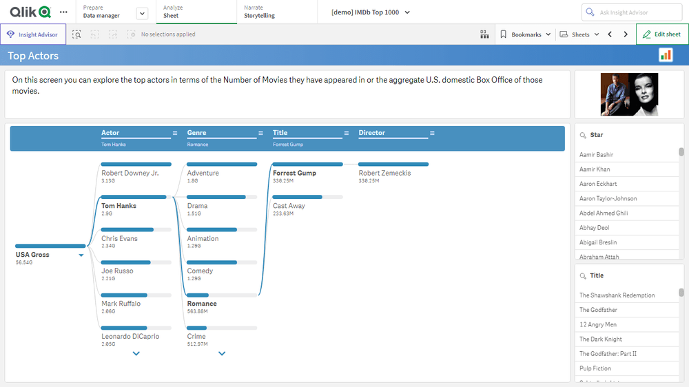 IMDb による歴代トップ 1000 本の映画を深掘りしましょう。映画コンテンツの情報源として世界で最も人気があると謳うオンラインデータベースです。トップ俳優を特定し、どの監督・ジャンル・年・個別作品が成功に最も寄与したかをすばやく把握できます。これらのディメンションを自由に切り替え、Qlik Sense の分解ツリーによる革新的な手法で、トップ監督・年・映画・ジャンルを同様に探索しましょう。