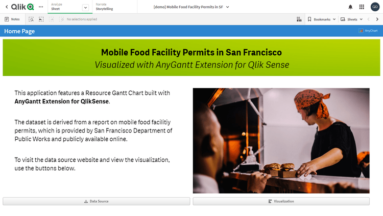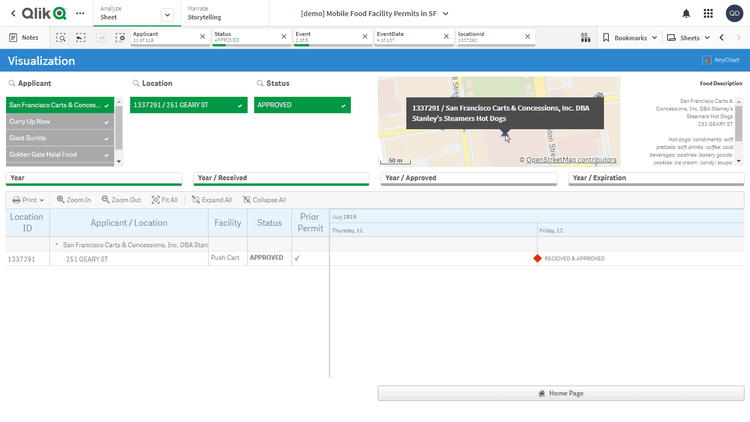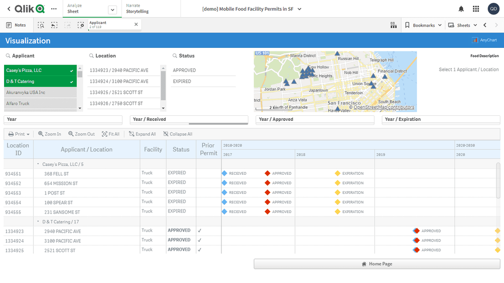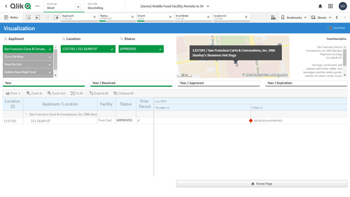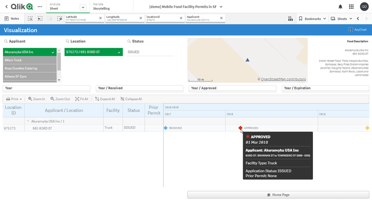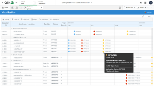 このアプリケーションでは、リソース・ガントチャートをAnyGantt extension for Qlik Senseで実装しています。データセットは、サンフランシスコ市公共事業局が公開する移動式食品施設許可のレポートに由来します。
