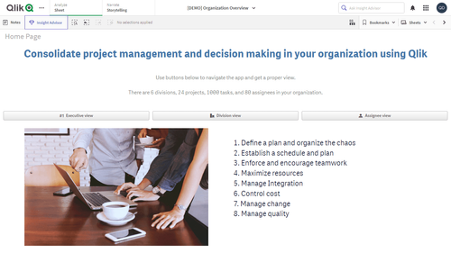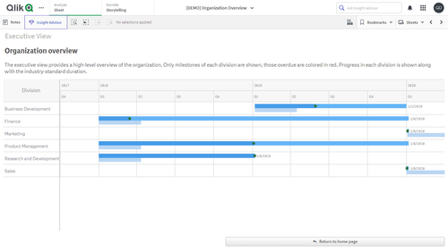 Qlik Sense のガントチャートを活用して、会社や組織におけるプロジェクト管理と意思決定を統合する優れた方法をご覧ください。複数の部門に多数の従業員が所属し、さまざまなプロジェクトで数千のタスクを抱えている状況を想像してみてください。すべての業務を包括的にひと目で把握し、究極の効率性と効果性をもってプロジェクト計画とスケジューリングを実行し、すべてのプロセスを確実に進行させましょう。