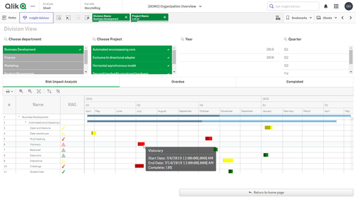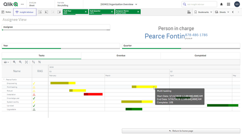 このアプリケーションには、Qlik Sense 用 AnyGantt 拡張機能で構築されたプロジェクトガントチャートが搭載されています。データセットは架空のものです。