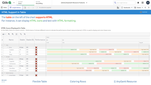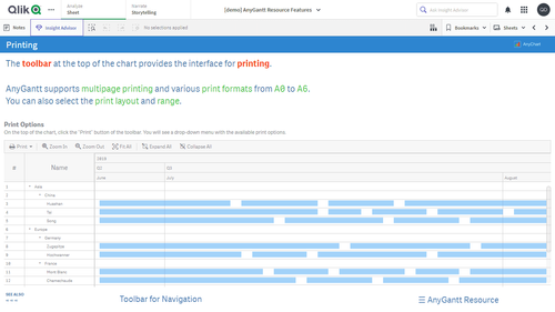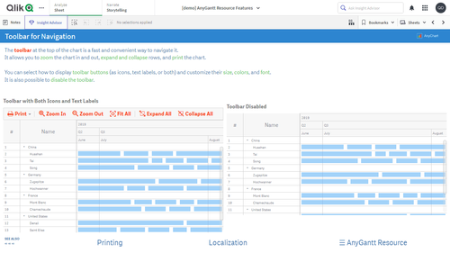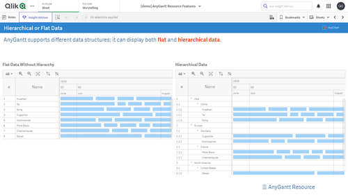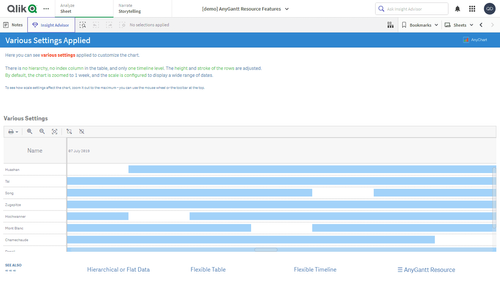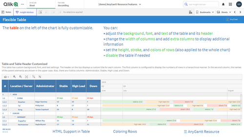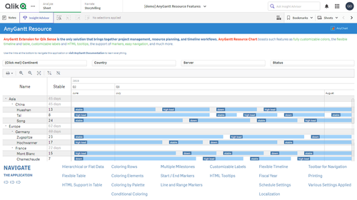 このアプリケーションには、Qlik Sense 用 AnyGantt 拡張機能で構築されたリソースガントチャートが搭載されています。データセットは架空のものです。
