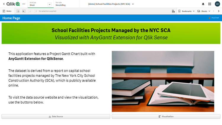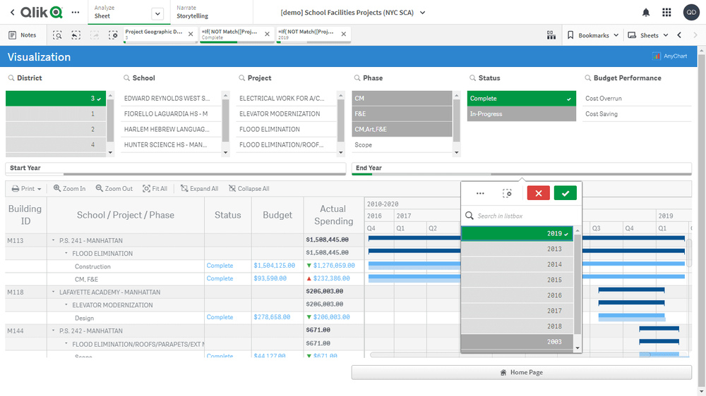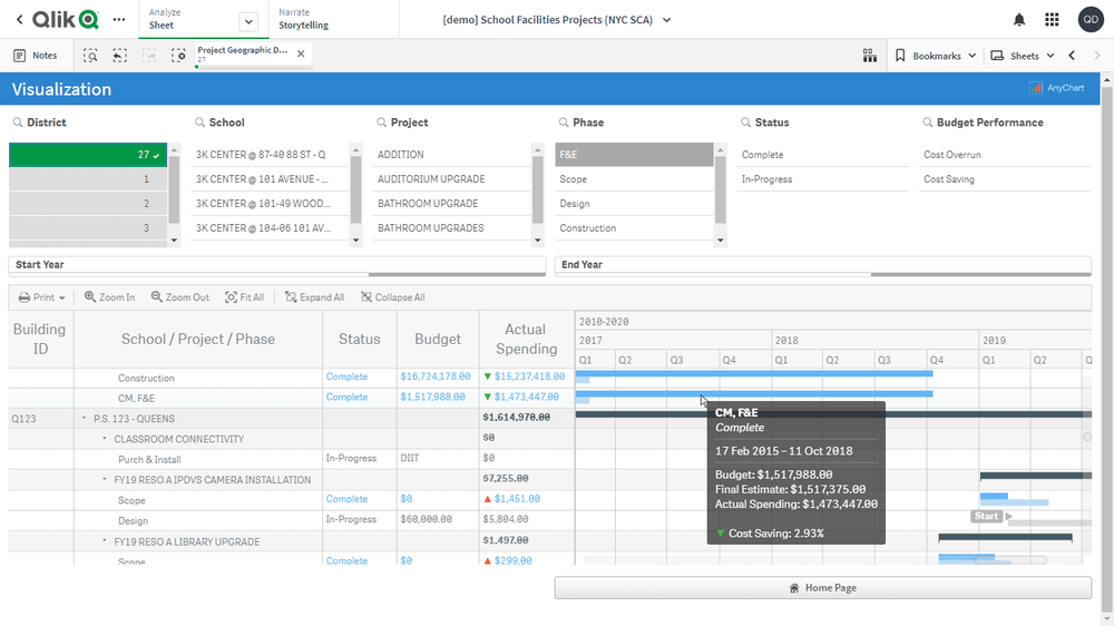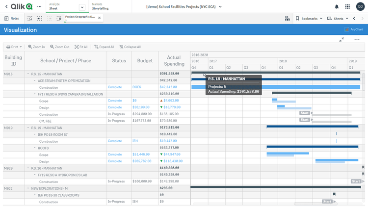 このアプリケーションでは、プロジェクト・ガントチャートをAnyGantt extension for Qlik Senseで実装しています。データセットは、ニューヨーク市学校建設局(NYCSCA)が公開する学校施設の資本プロジェクトに関するレポートに由来します。