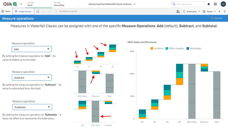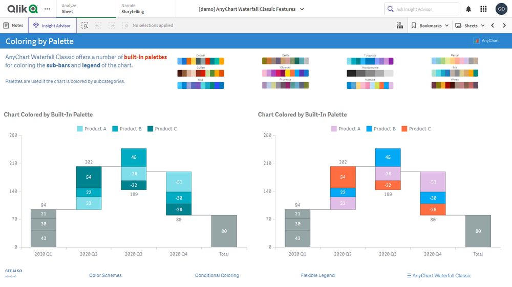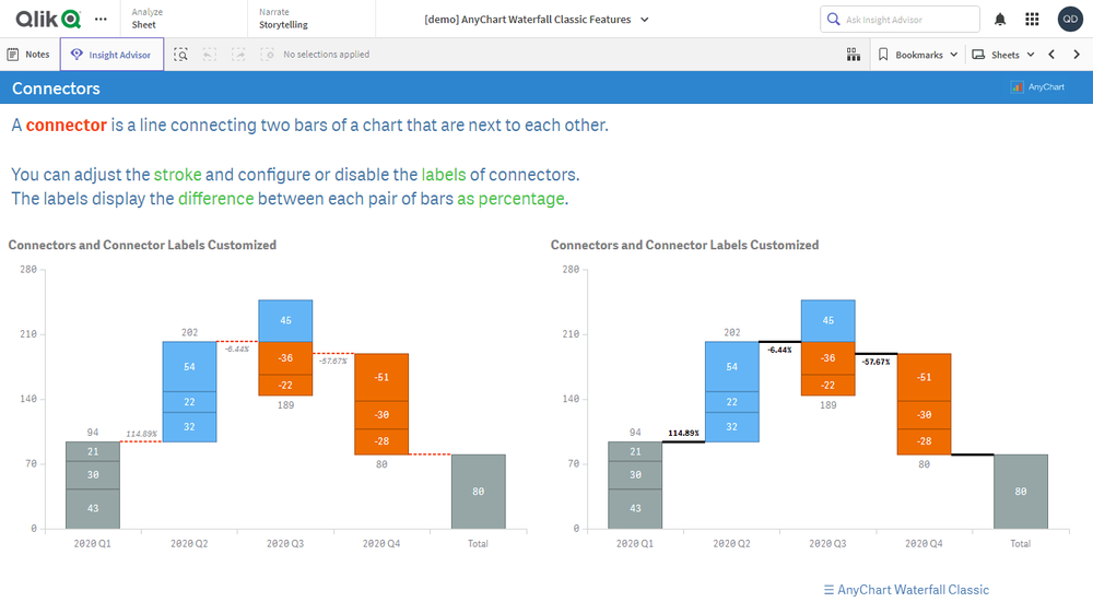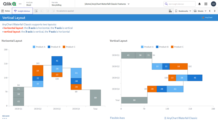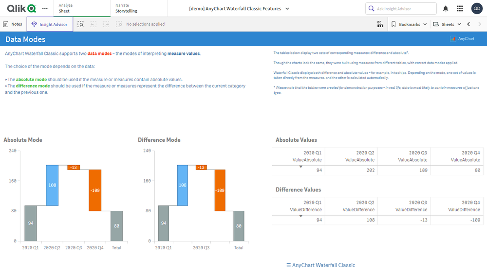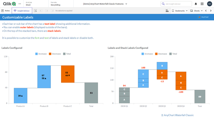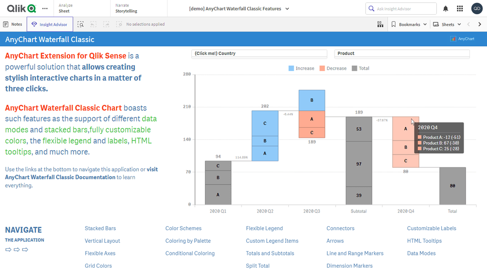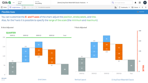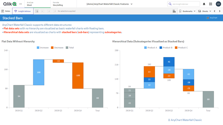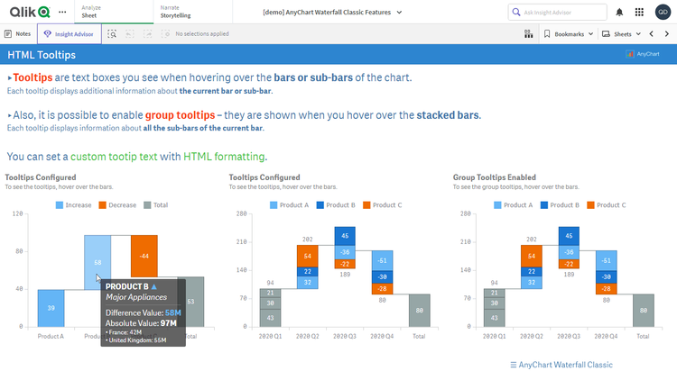 このアプリケーションには、Qlik Sense 用 AnyChart 拡張機能で構築されたクラシックウォーターフォールチャートが搭載されています。データセットは架空のものです。