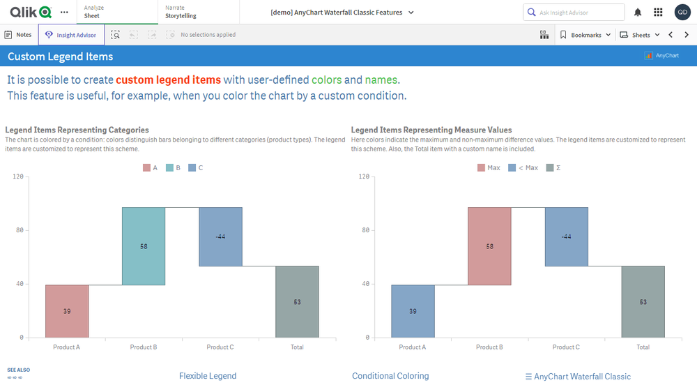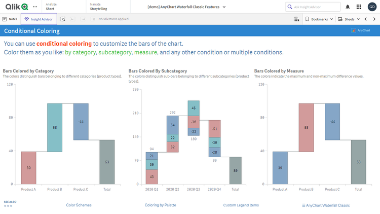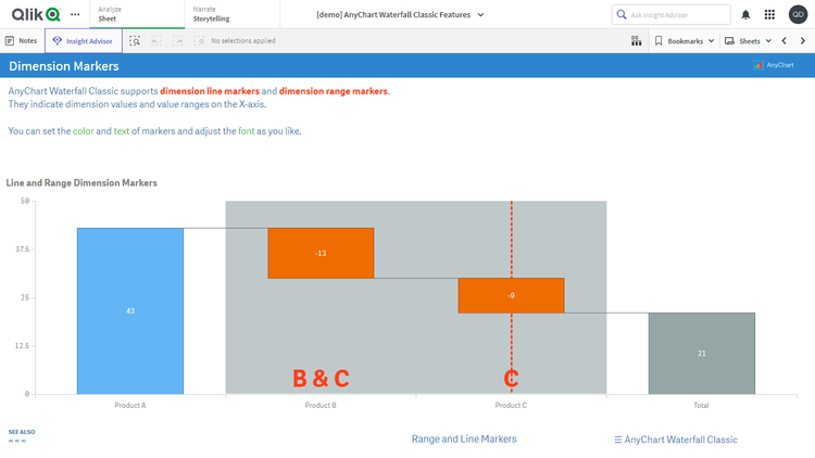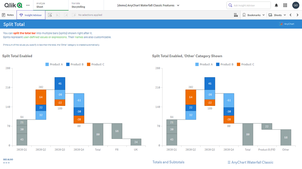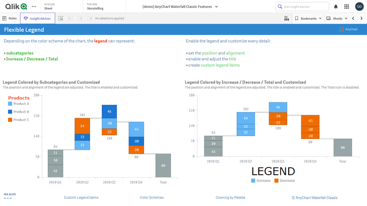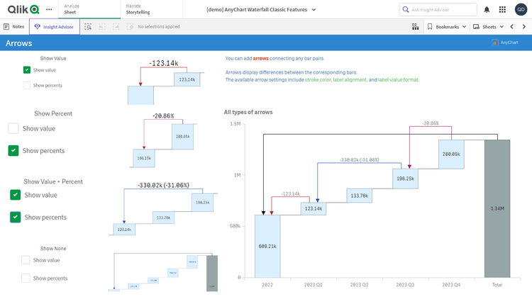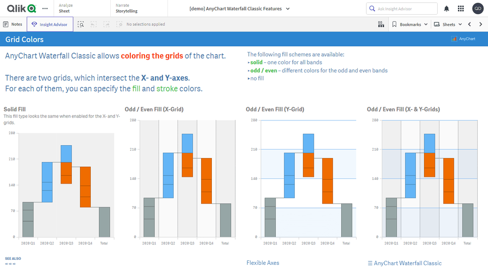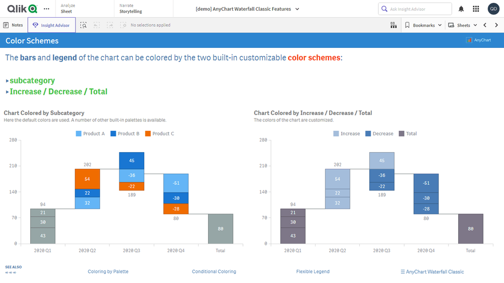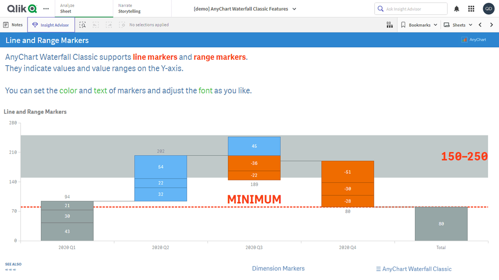 このアプリケーションには、Qlik Sense 用 AnyChart 拡張機能で構築されたクラシックウォーターフォールチャートが搭載されています。データセットは架空のものです。