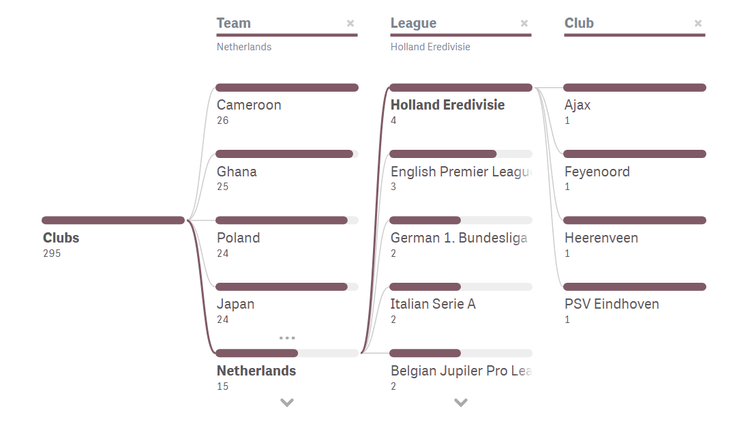 Qlik Sense の優れた分解ツリーを使って、カタール 2022 のワールドカップに出場した 32 か国の各代表チームが、どのリーグ・クラブ所属の選手で構成されているかを調査しましょう。合計値をどのように分解したいかに応じて、表示ディメンションの順序を自由に(再)配置できます。直感的な分解ツリーにより、代表チームのゴール数や出場数(キャップ)も同様に分析できます。