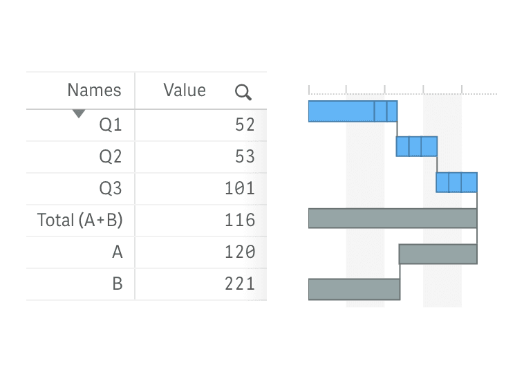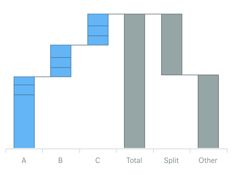 合計バーの表示オプションを拡張しました。標準的な単一の塗りつぶしバーや、合計バーを複数の連続したバーに分割できる便利なスプリット合計機能に加え、色付きまたは色なしのサブバーによる積み上げバーを選択できるようになりました。この追加により、合計に対するサブカテゴリの貢献度の評価が向上し、既存のオプションを補完することで、ウォーターフォールチャートにおける合計の視覚化を完全にコントロールできるようになります。
